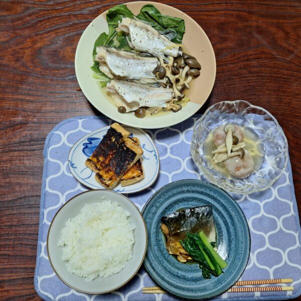 蓮根まんじゅう アラの酒蒸し 鯖の煮付け 油揚げの味噌焼き