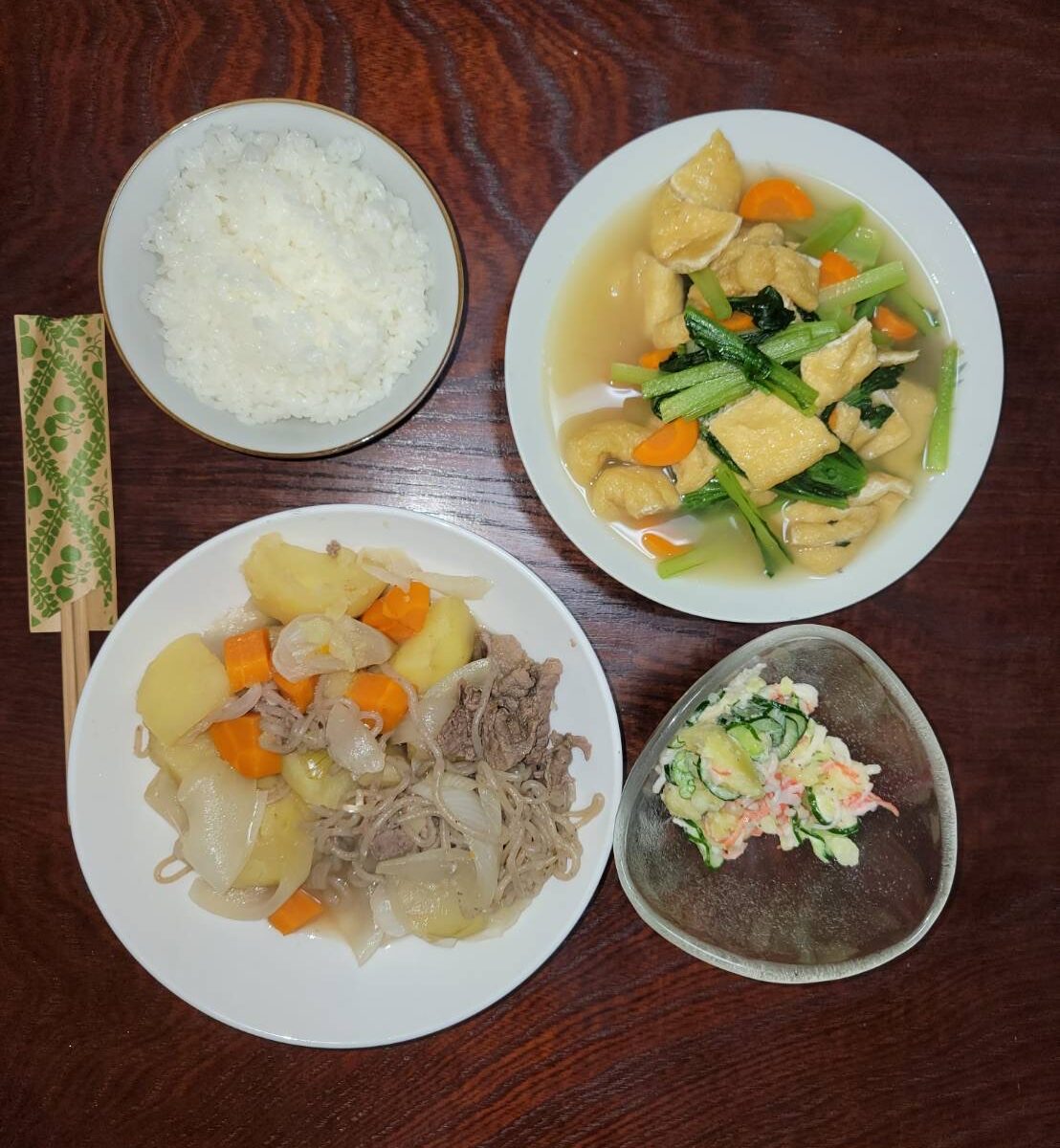 肉じゃがの味付けは、みりんや料理酒と醤油で良い感じの味わいで美味しかった。最初は薄味で作る。身体が疲れていると、ついつい味が濃くなりがちなので勉強になりました。ホウレン草の煮浸しも【糸こんにゃくやコーン】を入れても思ってる以上に更に美味しかったです。冷蔵庫の中であるものから料理って意外と難しいが、どんどん挑戦してみたいと思う。実験しているみたいで楽しかったです。